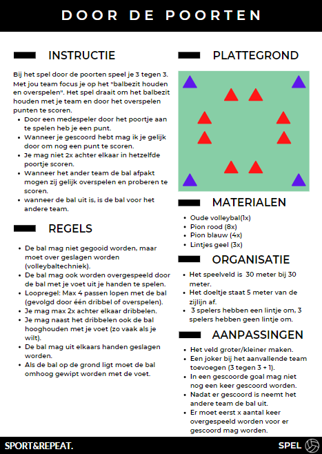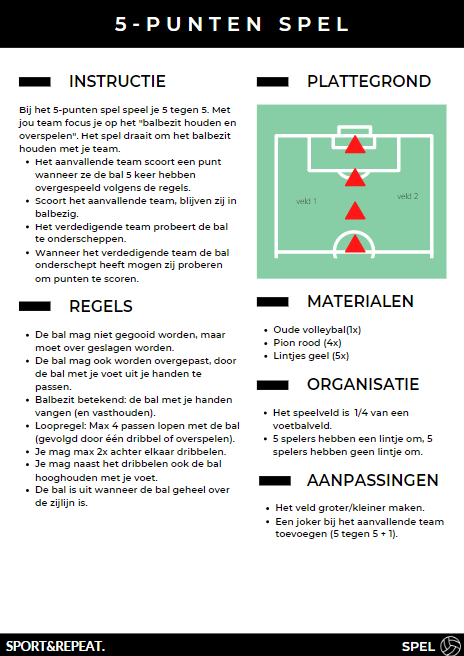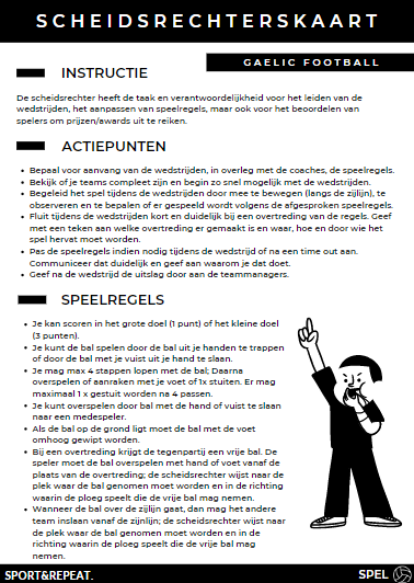 Gaelic Football Oefeningen over “balbezit behouden en overspelen”: VastpinnenBekijken Door-de-poortenBekijken 5-punten-spelBekijken Scheidsrechterkaart: ScheidsrechterBekijken