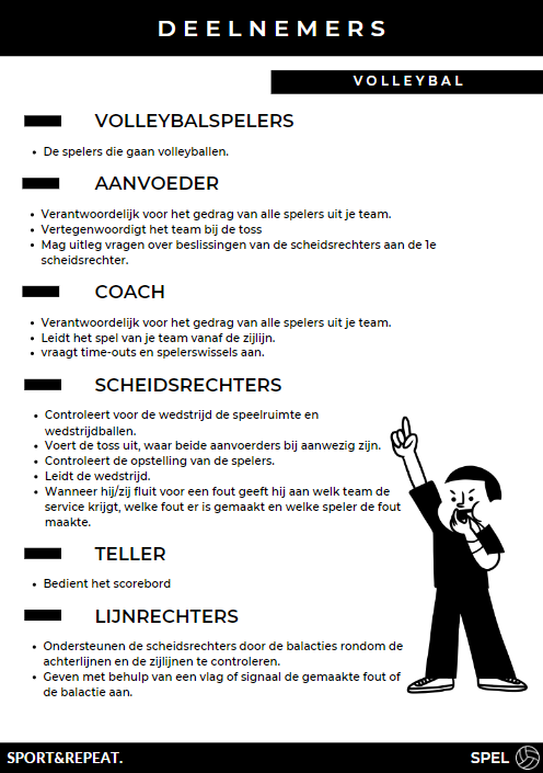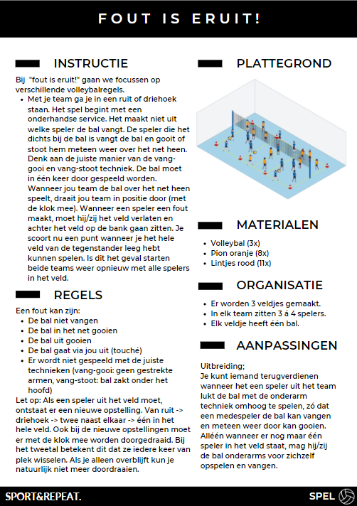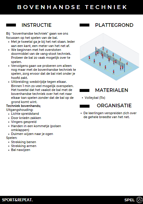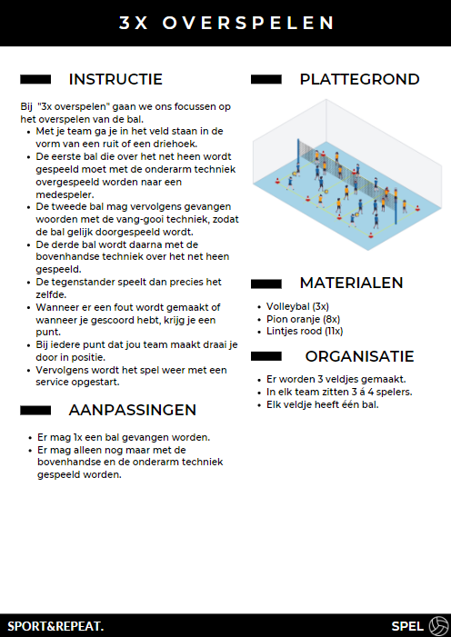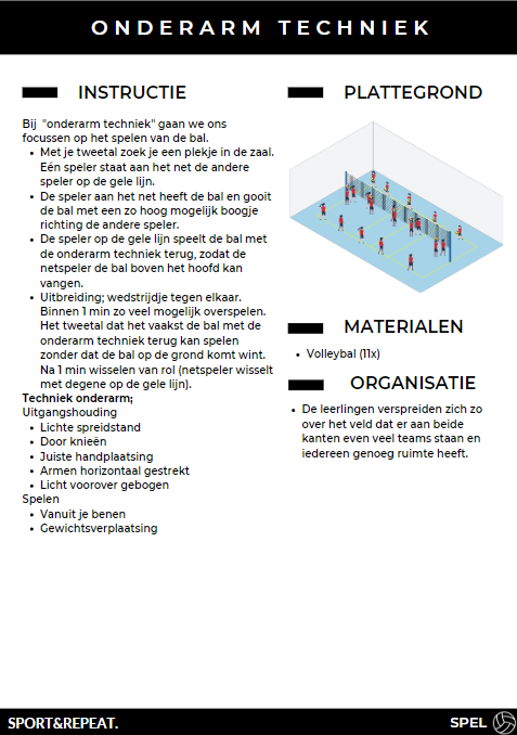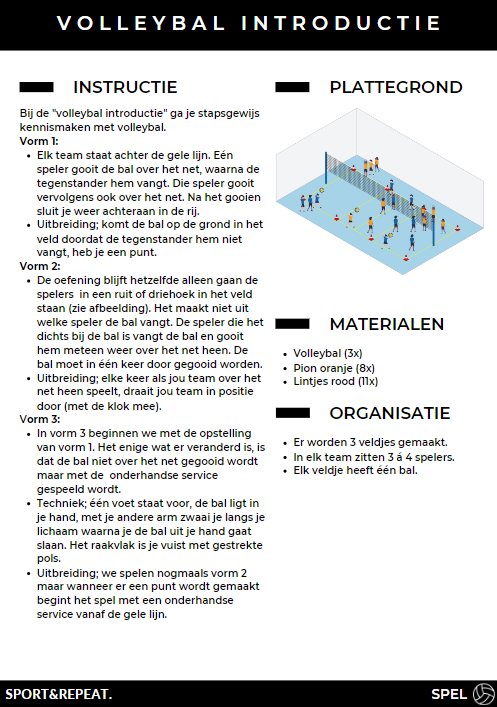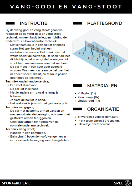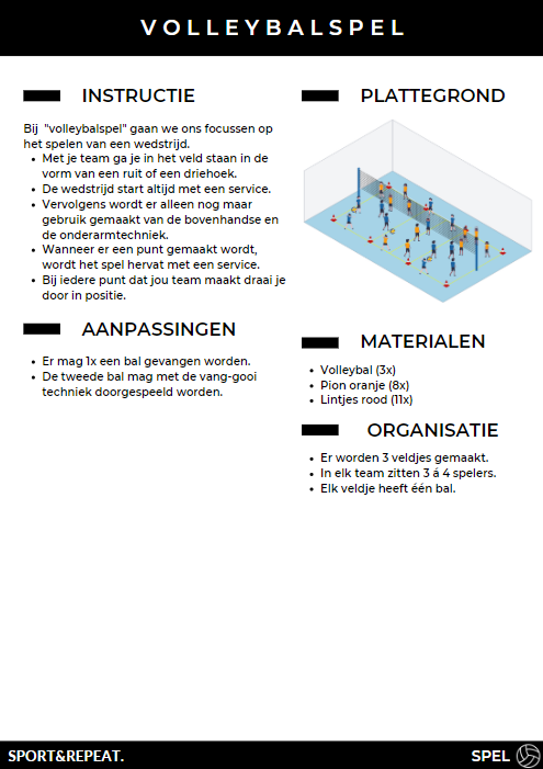 Volleybal Volleybal-deelnemersBekijken Volleybal-introductieBekijken Vang-gooi-en-vang-stootBekijken Onderarm-techniekBekijken Bovenhandse-techniekBekijken Fout-is-eruitBekijken 3x-OverspelenBekijken VolleybalspelBekijken
